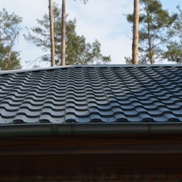 металлочерепица, которая отличается от классических моделей более строгими формами, подчеркивающими слияние традиций и современного подхода к дизайну.
